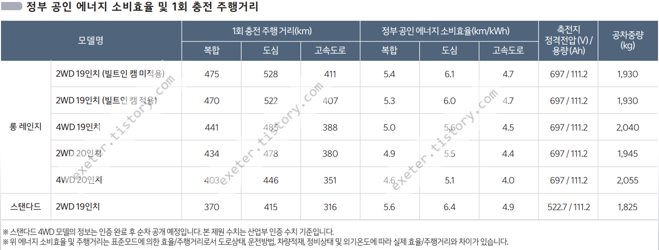 | 롱 레인지 | 2WD 19인치 (빌트인 캠 미적용) |