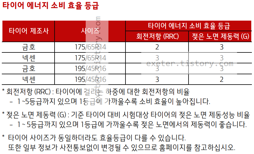 타이어 제조사: 금호/넥센 타이어 순정 사이즈 및 에너지 소비 효율 등급은 아래 그림 참고