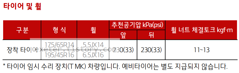 ※ 타이어 임시 수리 장치(TMK) 차량입니다. 예비타이어는 별도 지급되지 않습니다.