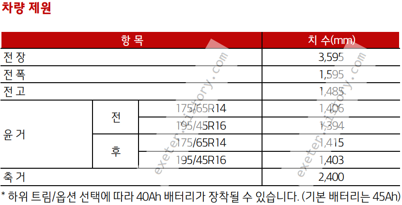 * 하위 트림/옵션 선택에 따라 40Ah 배터리가 장착될 수 있습니다. (기본 배터리는 45Ah)