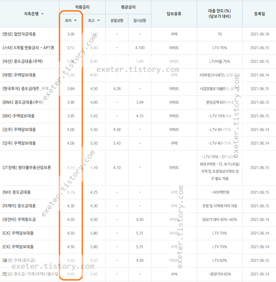 나머지 은행별 주담대 적용금리는 아래 그림을 참조하세요. (금리가 낮은 저축은행 순서)