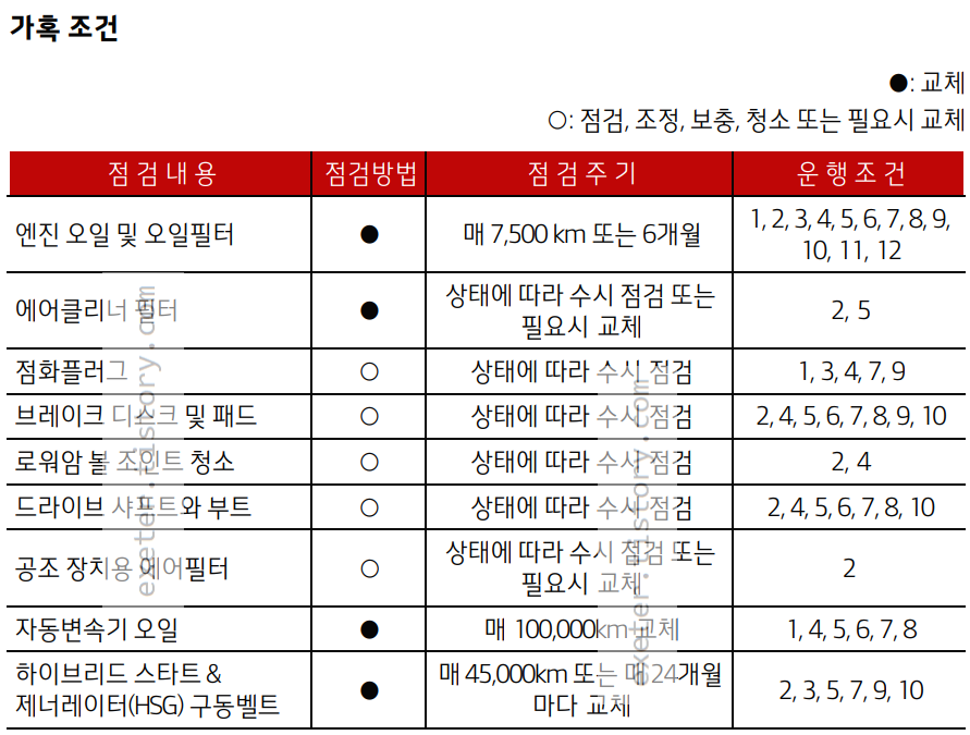 차량 설명서에서는 '가혹 조건'인 경우 교환/점검 주기를 빠르게 가져가도록 안내하고 있습니다.