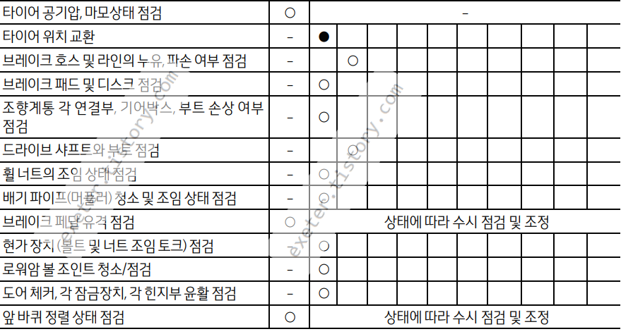 - 냉각수량 점검 및 교체: 최초교체 : 200,000km 또는 10년, 최초 교체후 매 40,000km 또는 매 2년 마다 교체