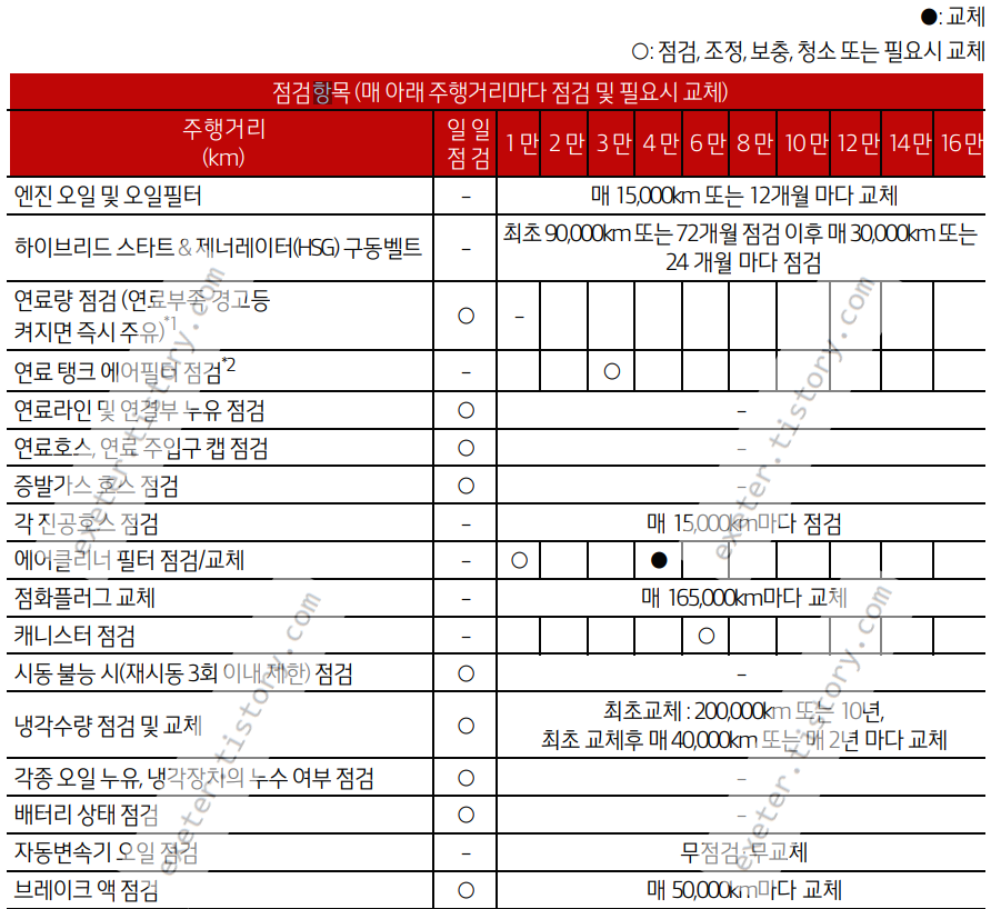- 하이브리드 스타트 & 제너레이터(HSG) 구동벨트: 최초 90,000km 또는 72개월 점검 이후 매 30,000km 또는 24 개월 마다 점검