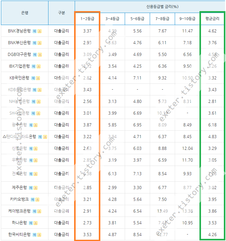 2021년 6월 취급된 신용대출 기준으로, 신용등급 1-2등급 기준, 신용대출 금리를 낮은 순서로 나열하면 아래와 같습니다.