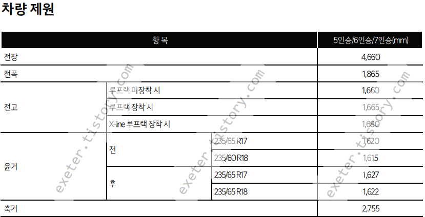 차량 치수 제원은 5인승/6인승/7인승 모두 동일합니다.