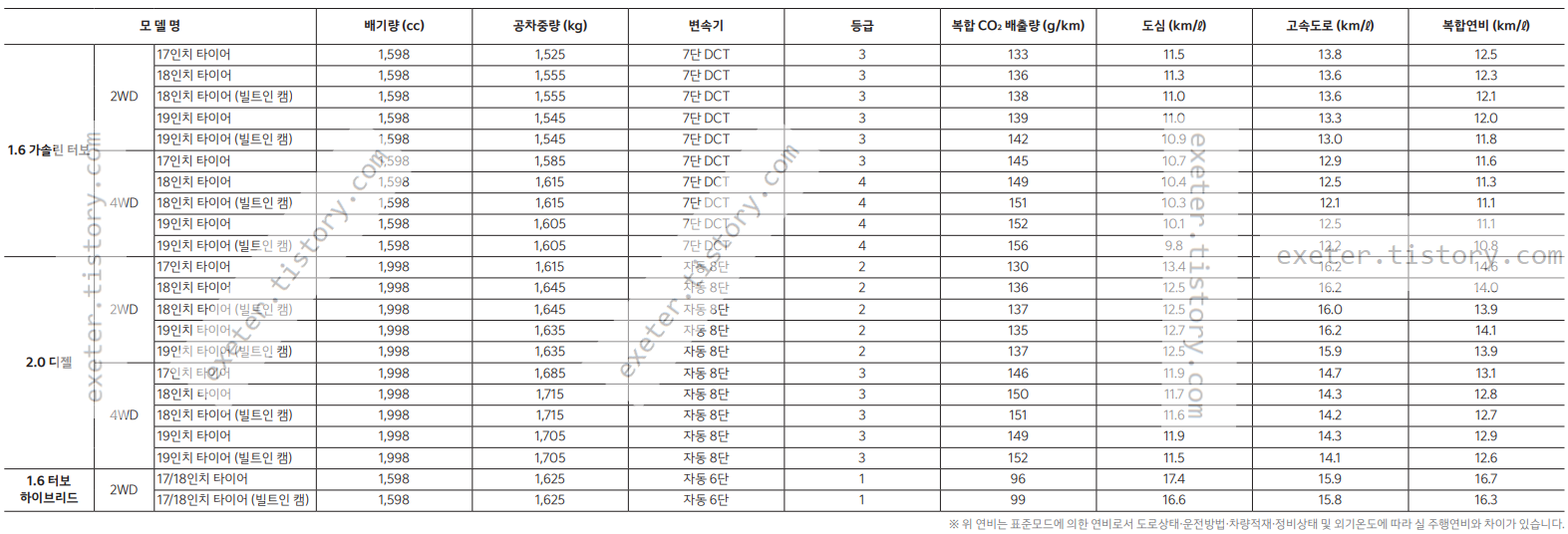 아래 그림 표는 2022 스포티지 가솔린 터보/ 디젤 / 하이브리드 모델 별 배기량 (cc) 공차중량 (kg) 변속기 등급 복합 CO2 배출량 (g/km) 도심 (km/ℓ) 고속도로 (km/ℓ) 복합연비(km/ℓ) 정보 입니다.