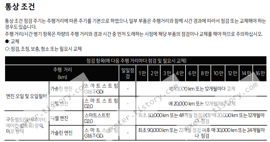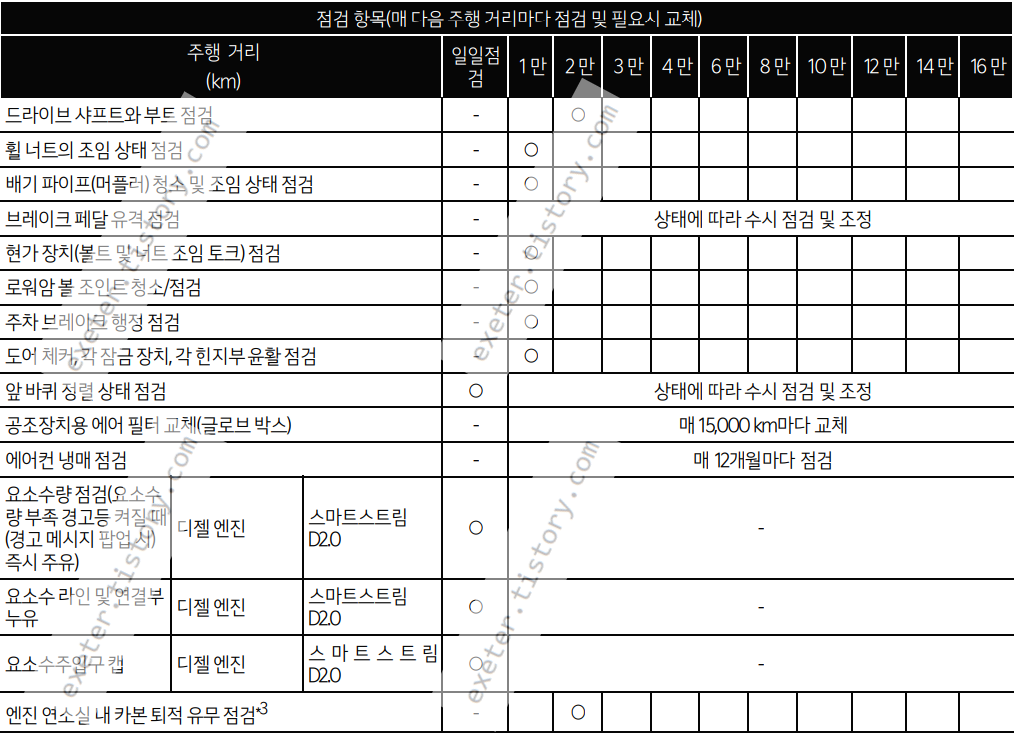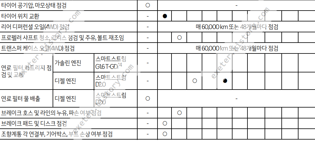 - 엔진 오일 및 오일필터 (디젤): 매 20,000km 또는 12개월 마다 교체