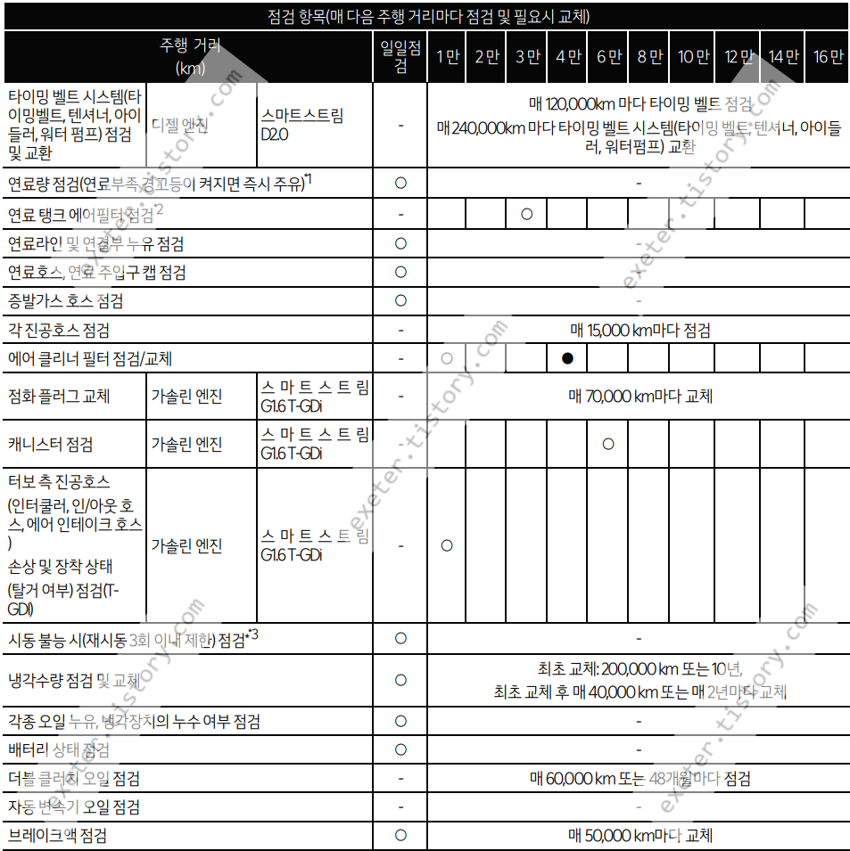 - 연료 필터 카트리지 점 검 및 교체 (디젤): 3만 km 점검, 6만 km 교체