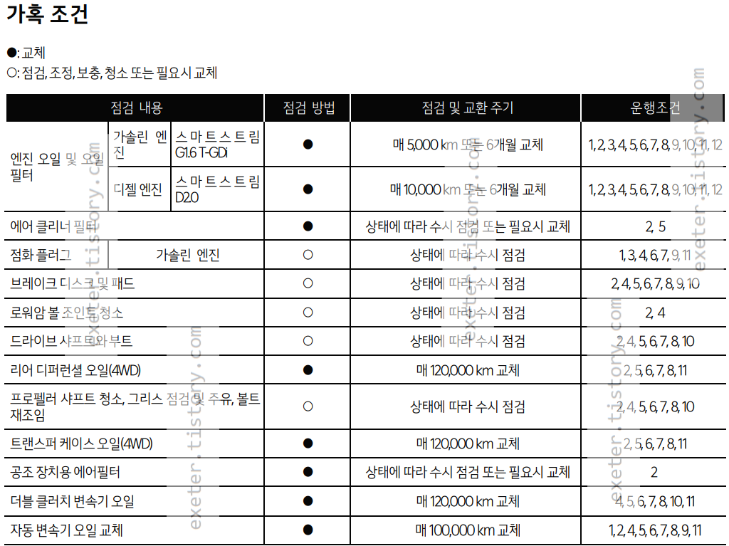 차량 설명서에서는 '가혹 조건'인 경우 교환/점검 주기를 빠르게 가져가도록 안내하고 있습니다.