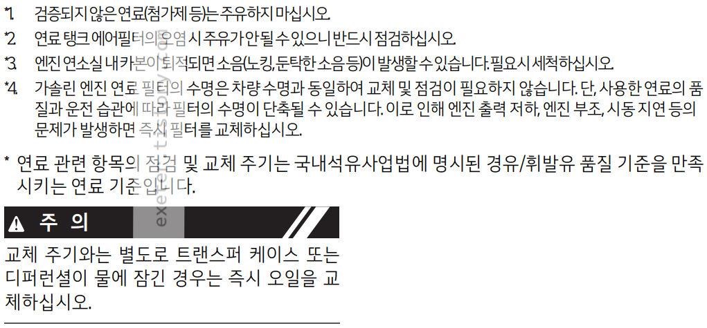*1. 검증되지 않은 연료(첨가제 등)는 주유하지 마십시오.