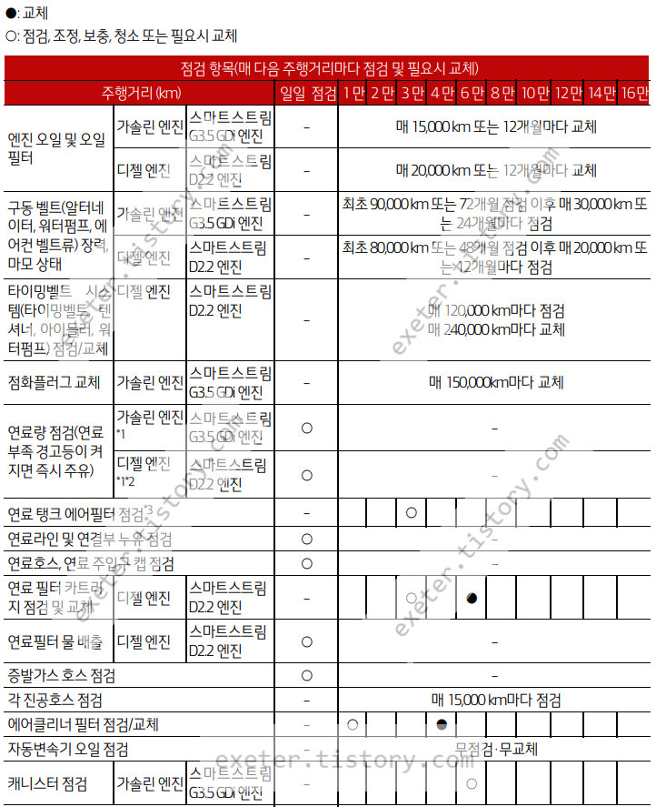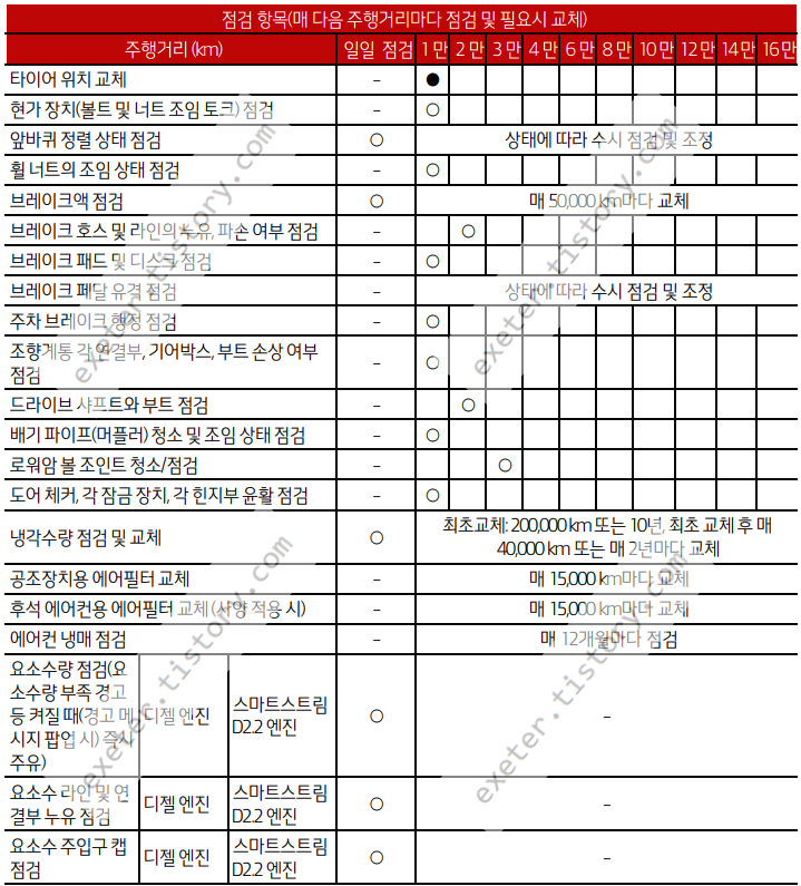 - 연료 필터 카트리 지 점검 및 교체 (디젤): 3만 km 점검, 6만 km 교체