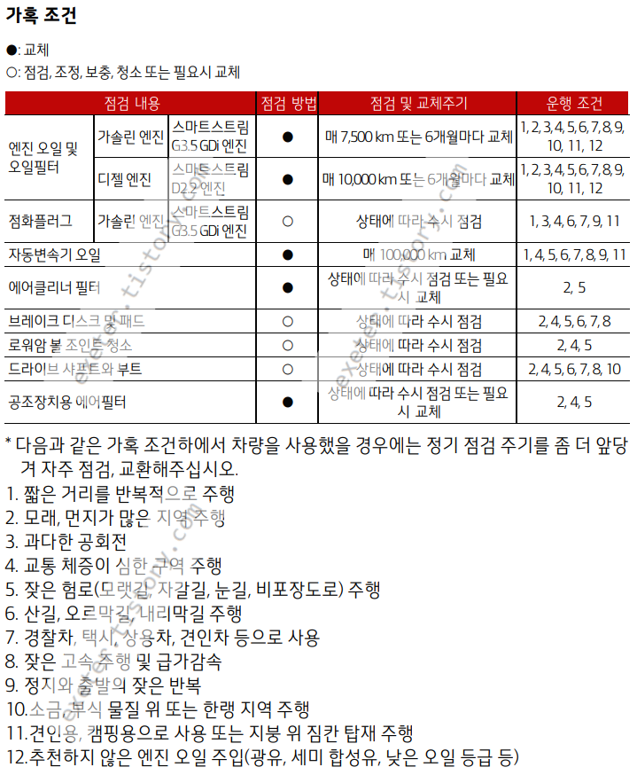 * 다음과 같은 가혹 조건하에서 차량을 사용했을 경우에는 정기 점검 주기를 좀 더 앞당겨 자주 점검, 교환해주십시오.