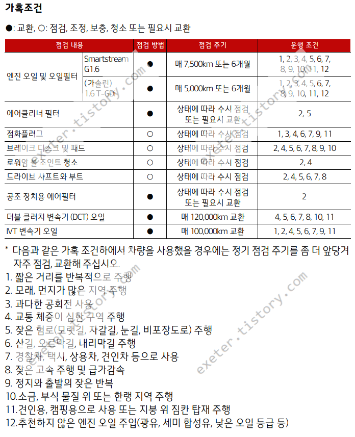 차량 사용 설명서에서는 '가혹 조건'인 경우 교환/점검 주기를 빠르게 가져가도록 안내하고 있습니다.