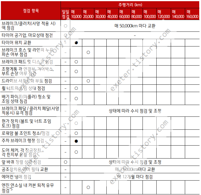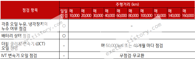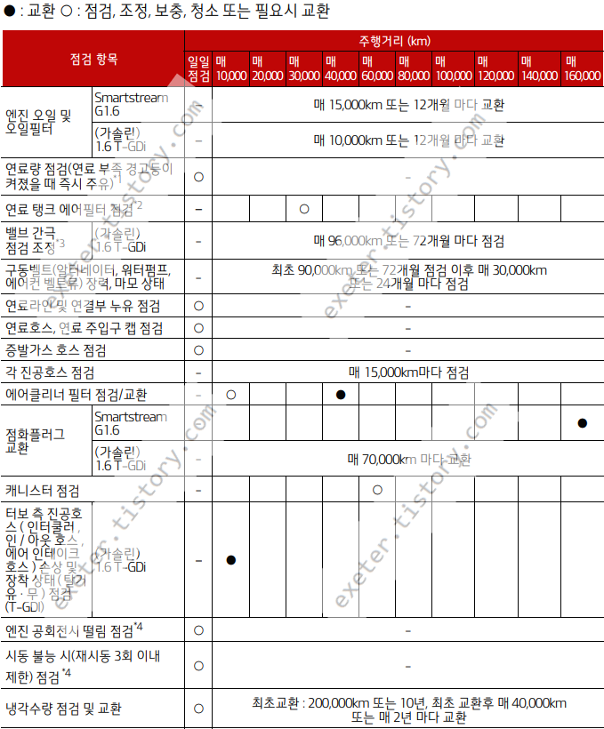 - 점화플러그 교환 (Smartstream G1.6): 매 16만 km 교환