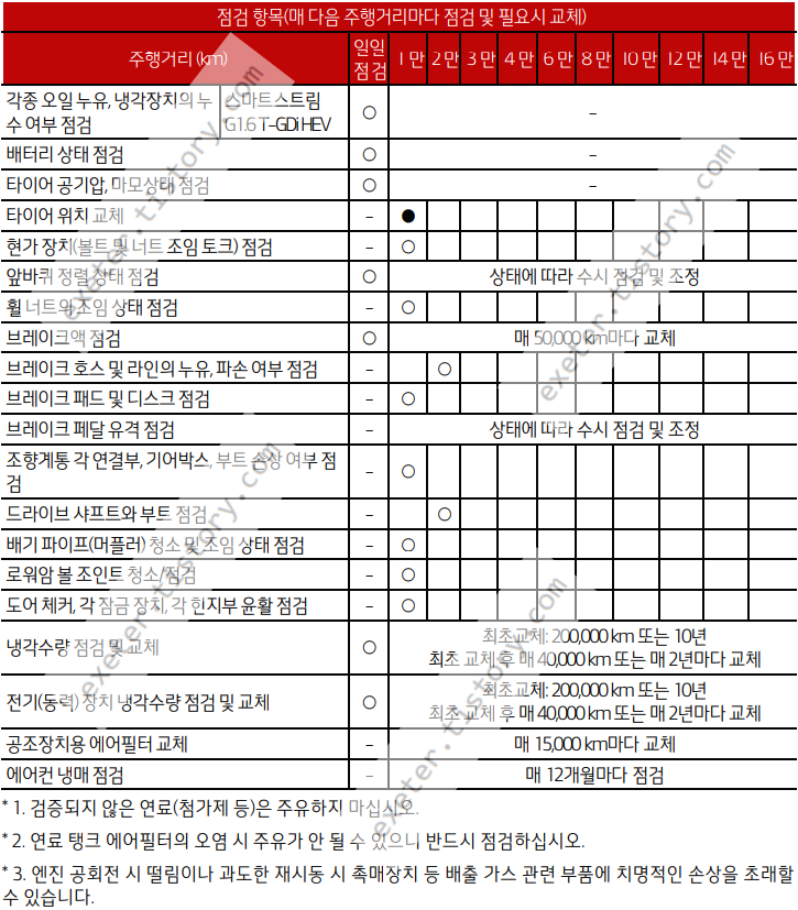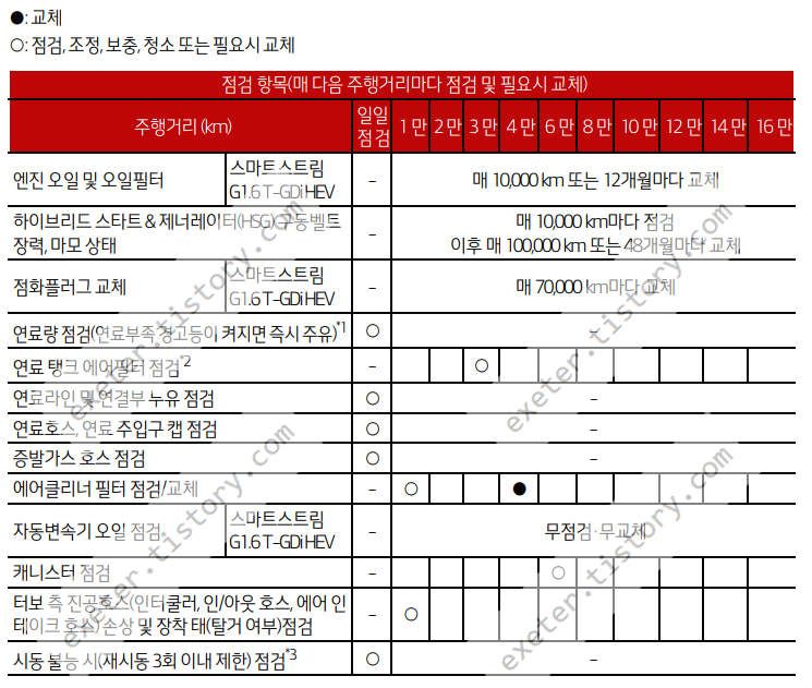 - 엔진 오일 및 오일필터 (스마트스트림 G1.6 T-GDi HEV): 매 10,000km 또는 12개월마다 교체