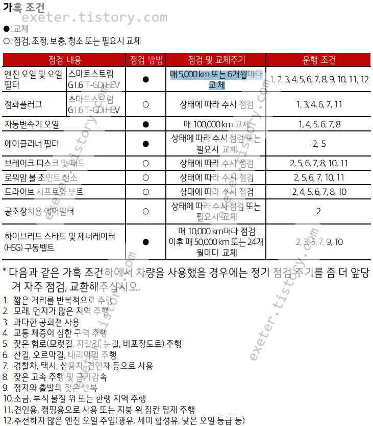 이러한 가혹 조건인 경우에는 엔진 오일은 '매 5,000Km 또는 6개월'마다 교체로 안내하고 있습니다.