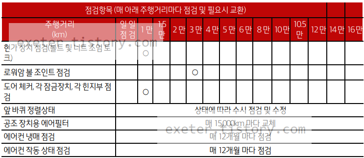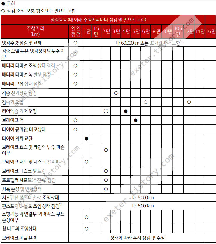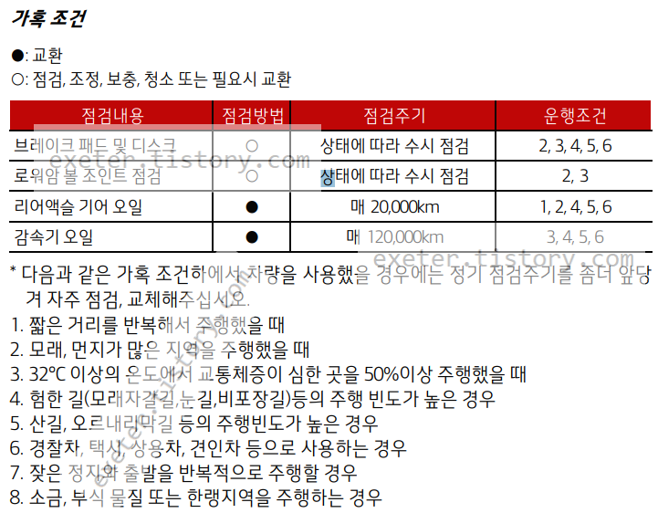 - 리어액슬 기어 오일: 매 2만 km 점검 / 매 4만 km 교환