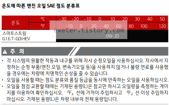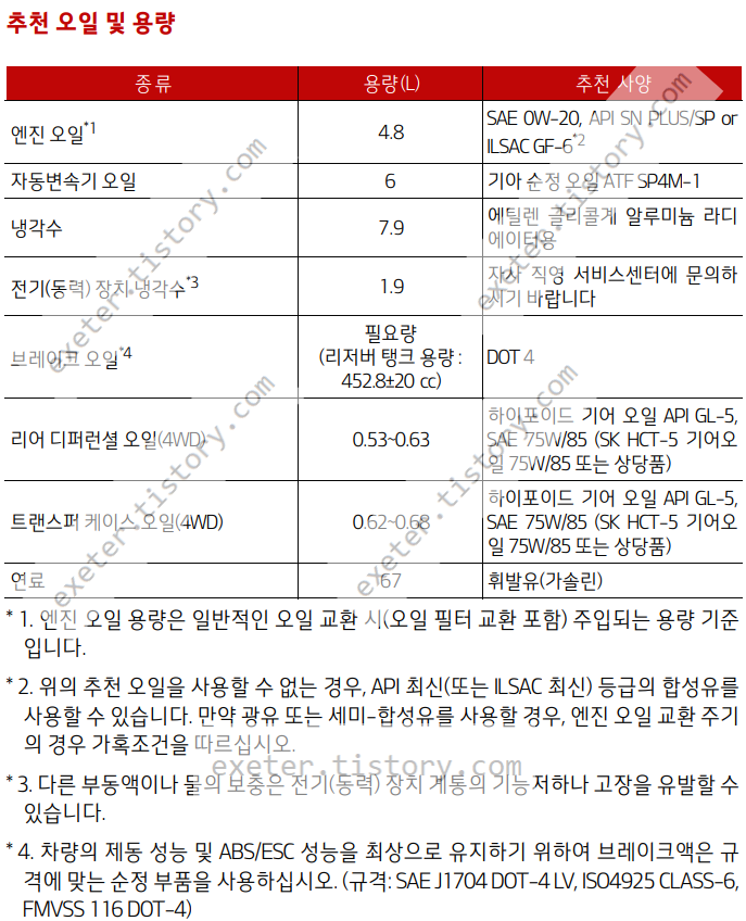 * 2. 위의 추천 오일을 사용할 수 없는 경우, API 최신(또는 ILSAC 최신) 등급의 합성유를 사용할 수 있습니다. 만약 광유 또는 세미-합성유를 사용할 경우, 엔진 오일 교환 주기 의 경우 가혹조건을 따르십시오.