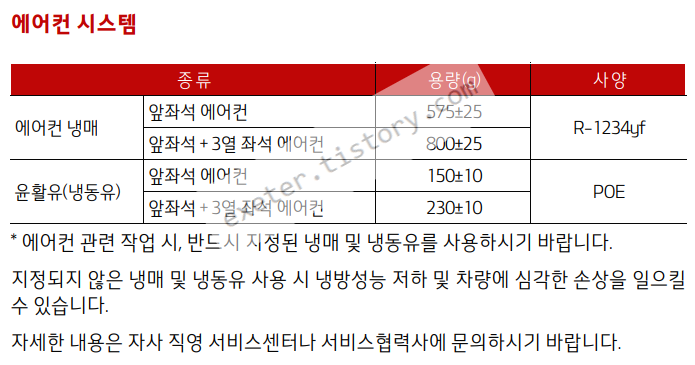 아래는 2022 쏘렌토 하이브리드 매뉴얼에서 발췌한 '에어컨 냉매 용량/사양'입니다.