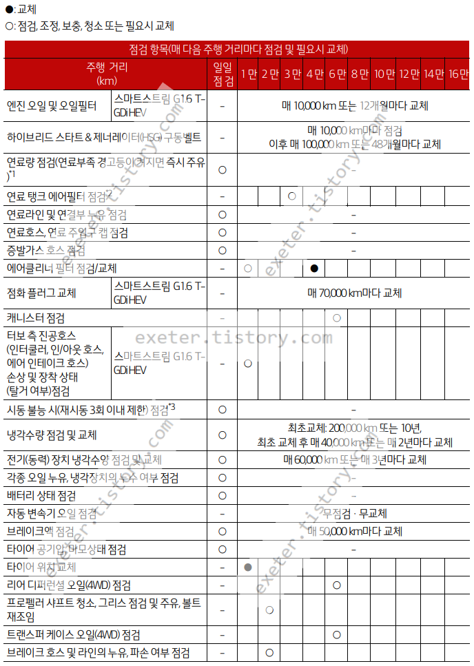 - 엔진 오일 및 오일필터 (스마트스트림 G1.6 TGDi HEV): 매 10,000km 또는 12개월 마다 교체