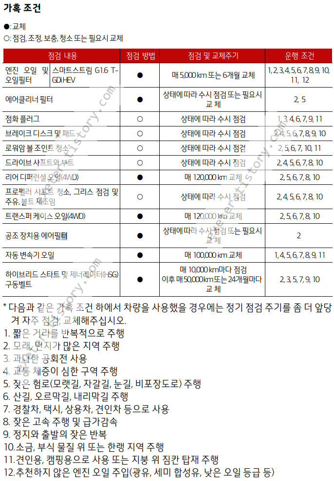 이러한 가혹 조건인 경우에는 엔진 오일은 '매 5,000Km 또는 6개월 마다 교체'로 안내하고 있습니다. 가혹 조건인 경우 점검주기가 비교적 짧습니다.