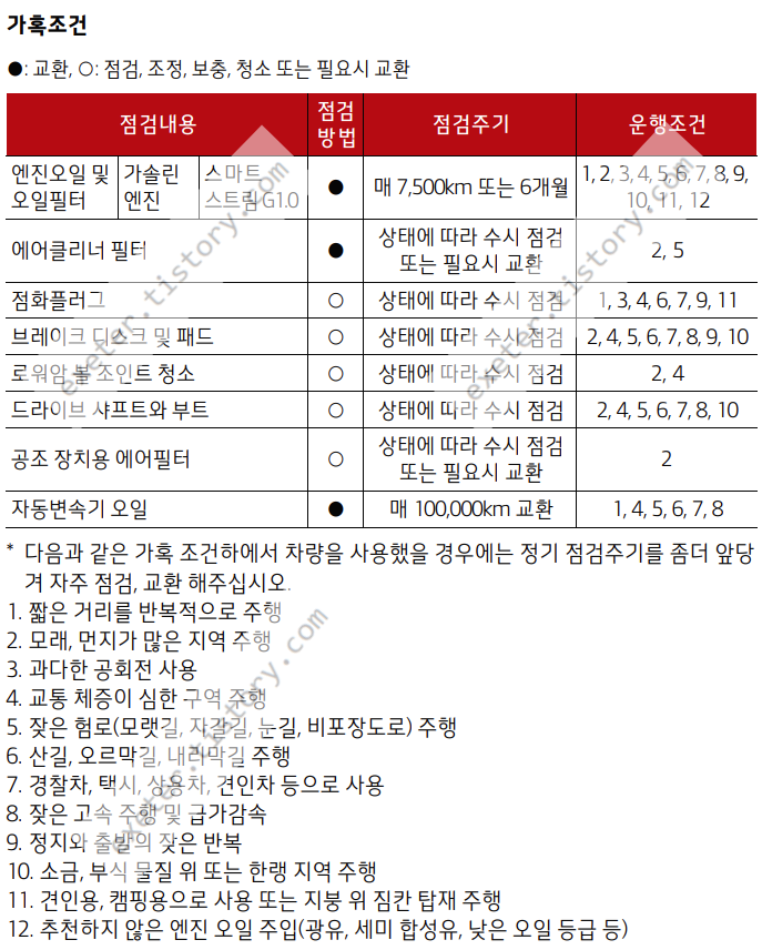 이러한 가혹 조건인 경우에는 엔진 오일은 '매 7,500Km 또는 6개월'마다 교체로 안내하고 있습니다.