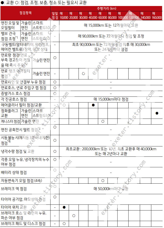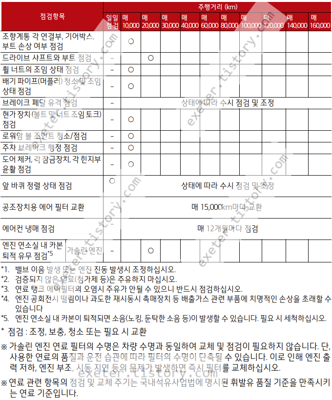 * 연료 관련 항목의 점검 및 교체 주기는 국내석유사업법에 명시된 휘발유 품질 기준을 만족시키 는 연료 기준입니다.