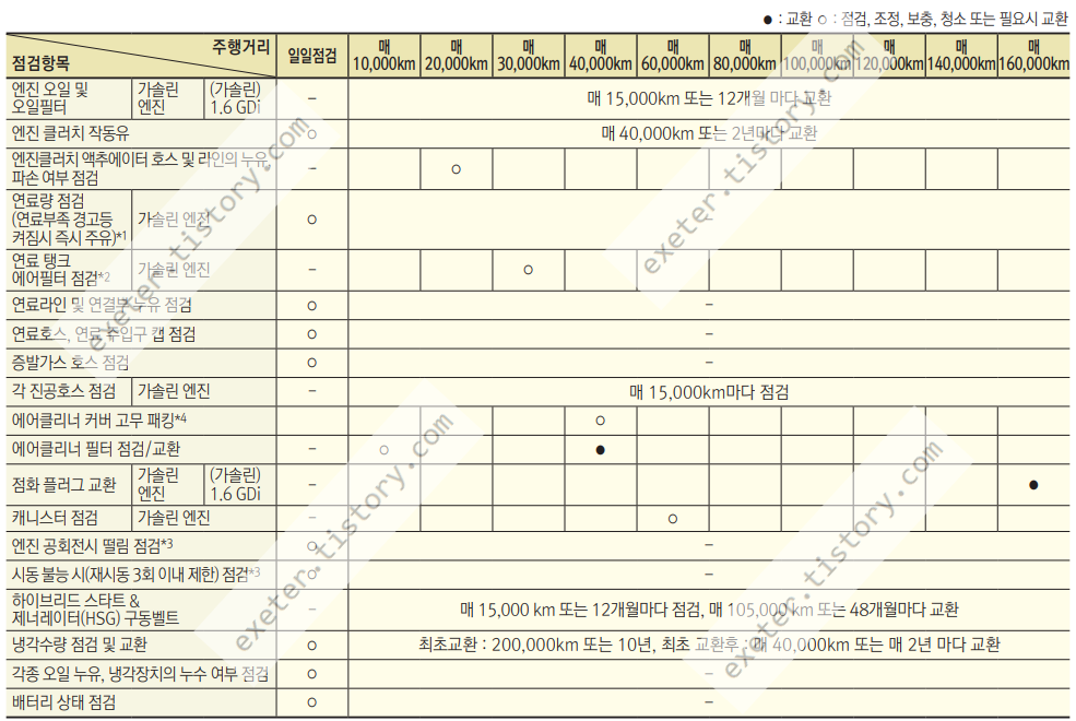 - 엔진 오일 및 오일필터 (가솔린 1.6 GDi): 매 15,000km 또는 12개월마다 교체