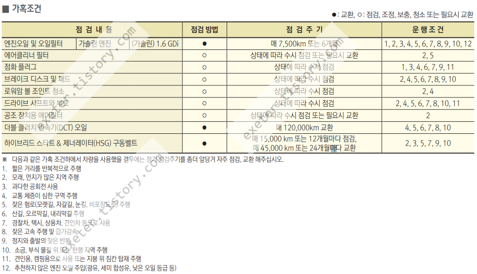 차량 사용 설명서에서는 '가혹 조건'인 경우 교환/점검 주기를 빠르게 가져가도록 안내하고 있습니다.