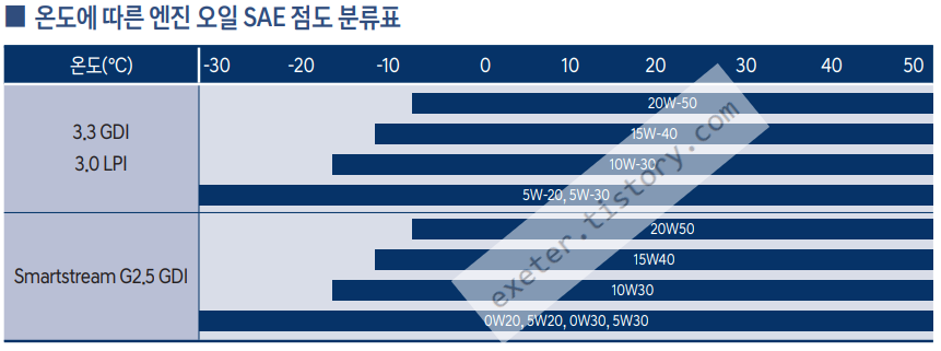 아래는 2021 그랜저IG 매뉴얼에서 발췌한 '온도에 따른 엔진 오일 SAE 점도 분류표'입니다.