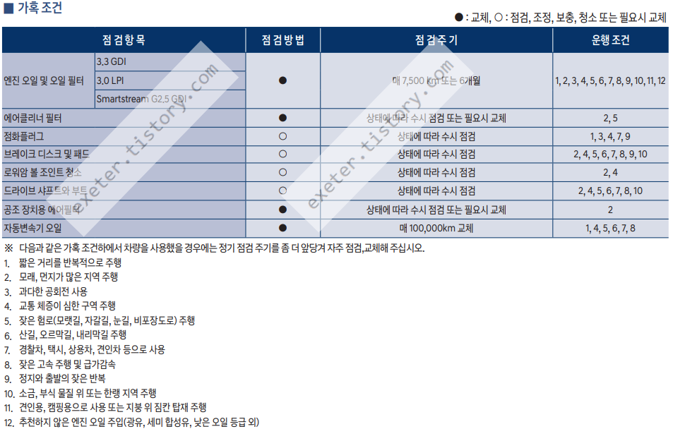 이러한 가혹 조건인 경우에는 엔진 오일은 '매 7500Km 또는 6개월'마다 교체로 안내하고 있습니다.