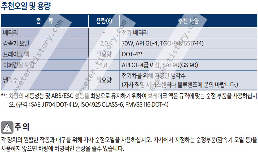 주의 - 각 장치의 원활한 작동과 내구를 위해 자사 순정오일을 사용하십시오. 자사에서 지정하는 순정부품(감속기 오일 등)을 사용하지 않으면 차량에 치명적인 손상을 줄수 있습니다.