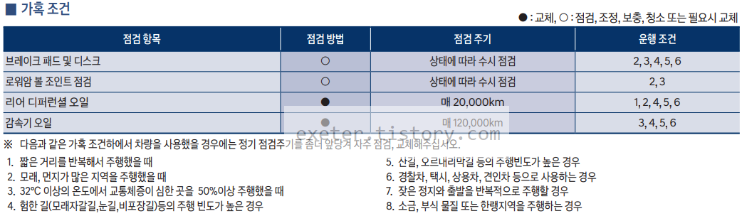 차량 사용 설명서에서는 '가혹 조건'인 경우 교환/점검 주기를 빠르게 가져가도록 안내하고 있습니다.