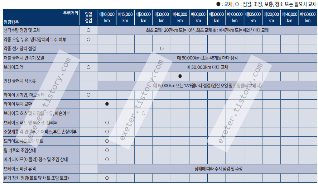 - 냉각수량 점검 및 교체: 최초 교체 : 20만km 또는 10년, 최초 교체 후 : 매 4만km 또는 매 2년 마다 교체