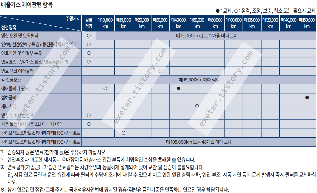 ※ 상기 연료관련 점검/교체 주기는 국내석유사업법에 명시된 경유/휘발유 품질기준을 만족하는 연료일 경우 해당됩니다