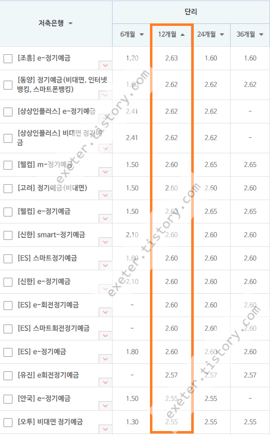 은행 상품명 / 기본금리 (단리 이자(%), 12개월, 높은 이자순서)