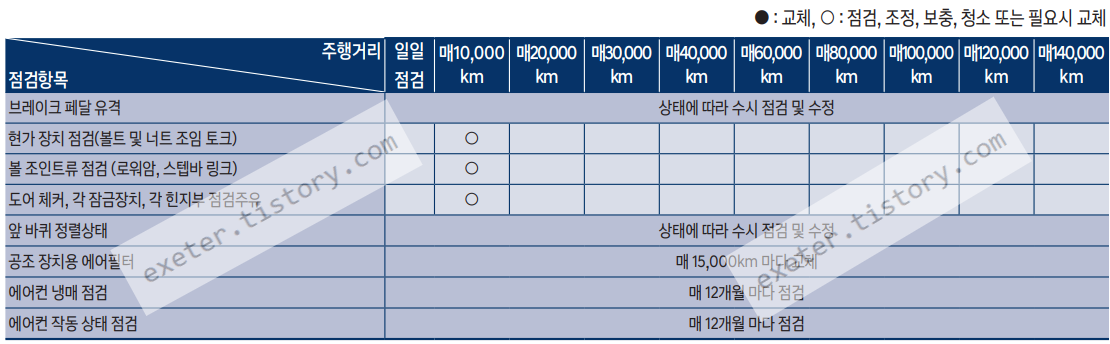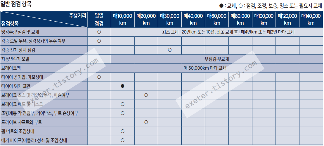 - 냉각수량 점검 및 교체: 최초 교체 : 20만km 또는 10년, 최초 교체 후 : 매 4만km 또는 매 2년 마다 교체