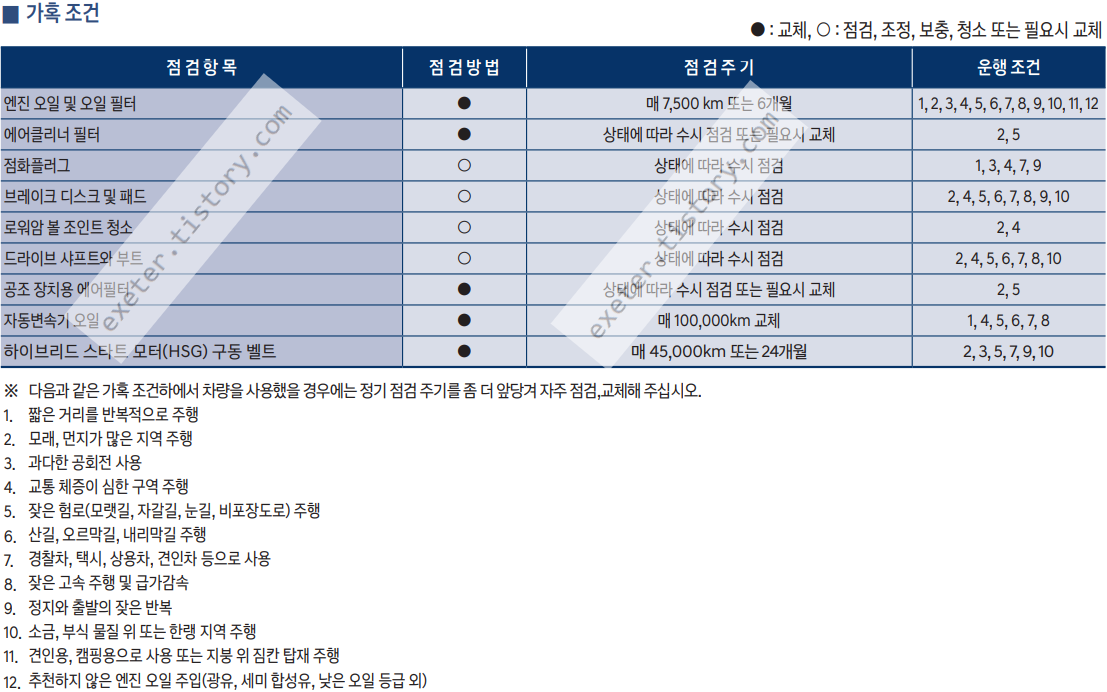 차량 사용 설명서에서는 '가혹 조건'인 경우 교환/점검 주기를 빠르게 가져가도록 안내하고 있습니다.