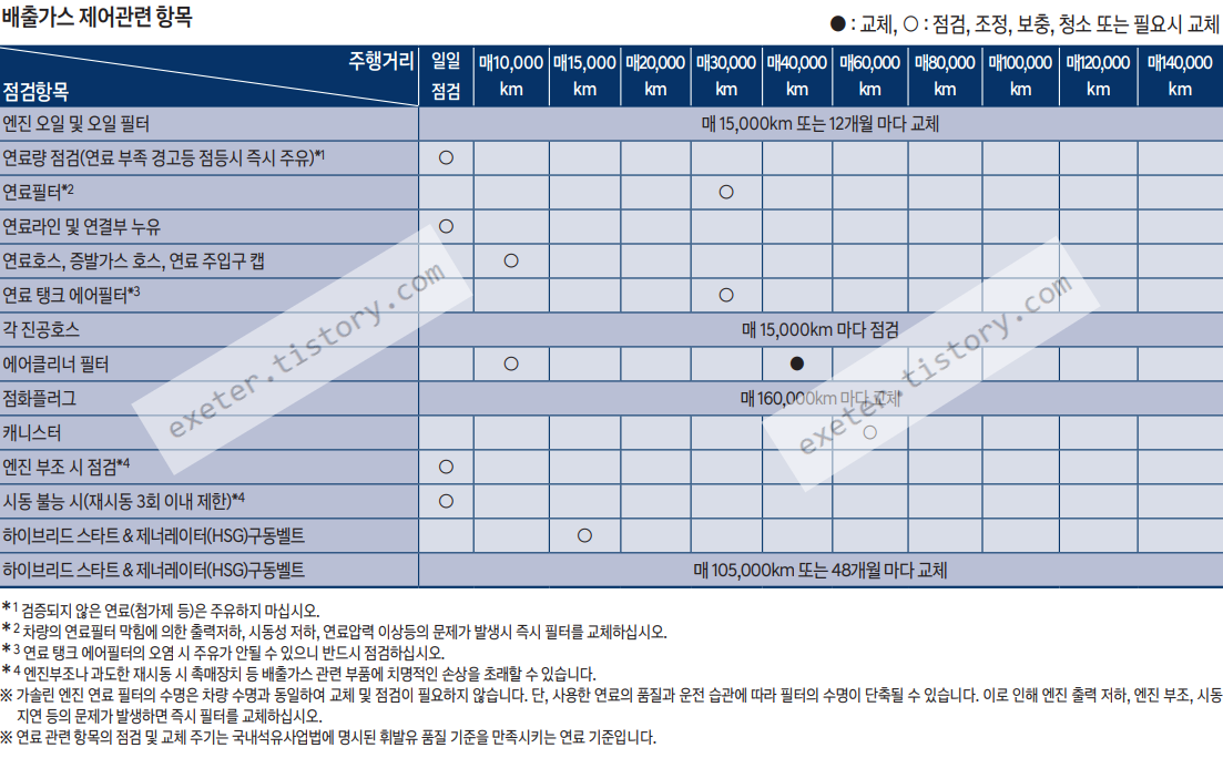 ※ 연료 관련 항목의 점검 및 교체 주기는 국내석유사업법에 명시된 휘발유 품질 기준을 만족시키는 연료 기준입니다.