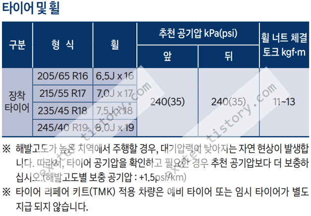 ※ 해발고도가 높은 지역에서 운행할 경우, 대기압력이 낮아지는 자연 현상이 발생합니다. 따라서, 타이어 공기압을 확인하고 필요한 경우 추천 공기압보다 더 보충 하십시오. (해발고도별 보충 공기압 : +1.5 psi/km)