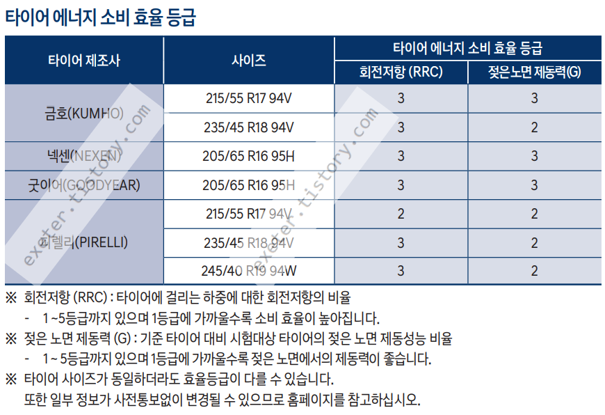 *타이어 사이즈가 동일하더라도 효율등급이 다를 수 있습니다. 또한 일부 정보가 사전 통보 없이 변경될 수 있으므로 홈페이지를 참고하십시오.