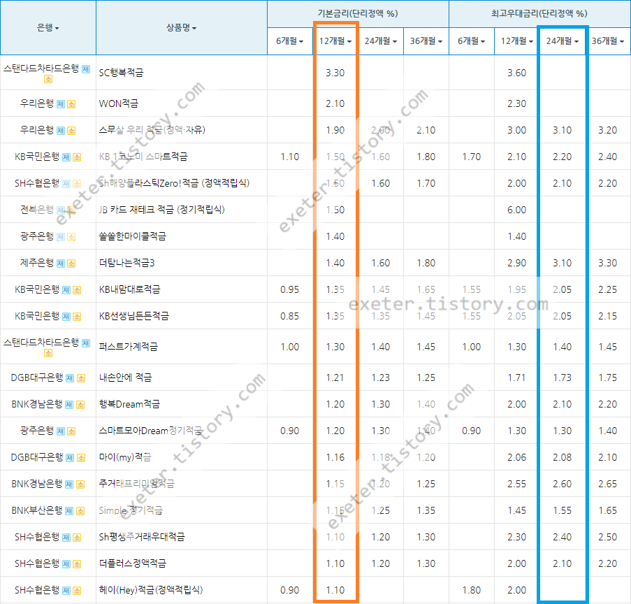 아래는 시중은행 적금 상품의 정기적금 금리를 정액적립식/단리/12개월 기준, 높은 순서로 정렬한 자료입니다.