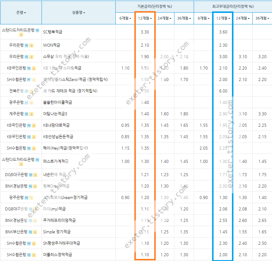 아래는 시중은행 적금 상품의 정기적금 금리를 정액적립식/단리/12개월 기준, 높은 순서로 정렬한 자료입니다.