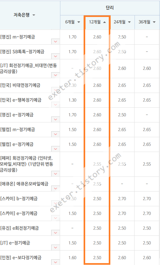 은행 상품명 / 기본금리 (단리 이자(%), 12개월, 높은 이자순서)