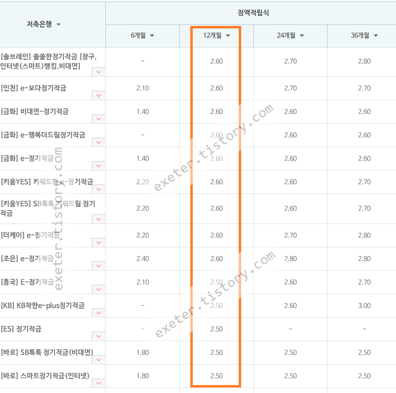 아래 목록에서는 일부 특별한 조건으로 가입해야 고금리를 제시하는 저축은행 상품은 작성자 판단으로 임의 제거했습니다. 따라서 아래에 제시한 상품의 대부분은 비대면/인터넷 가입이 가능한 상품으로, 특별한 부가 조건 없이 제공되는 금리입니다.