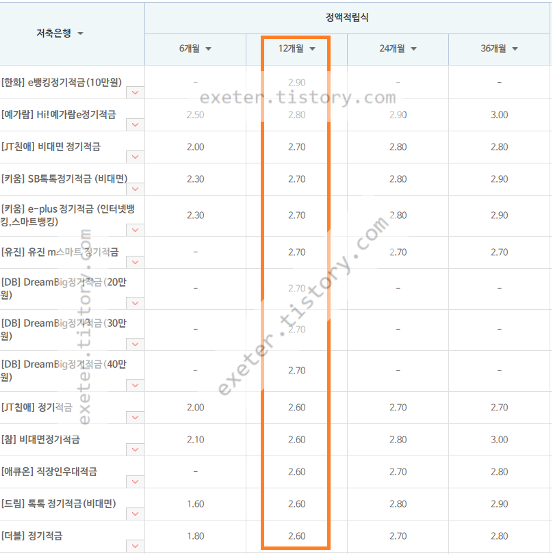 1. [한화] e뱅킹정기적금(10만원) / 2.9 %