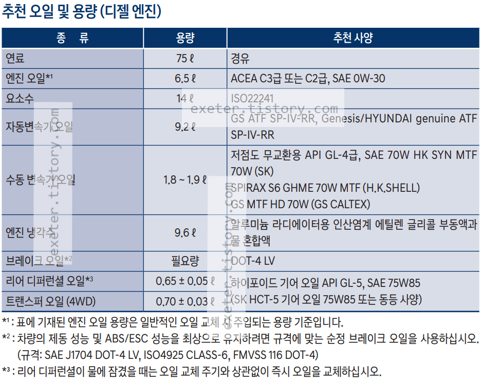 - 자동변속기 오일: 9.2 리터 (GS ATF SP-IV-RR, Genesis/HYUNDAI genuine ATF SP-IV-RR)