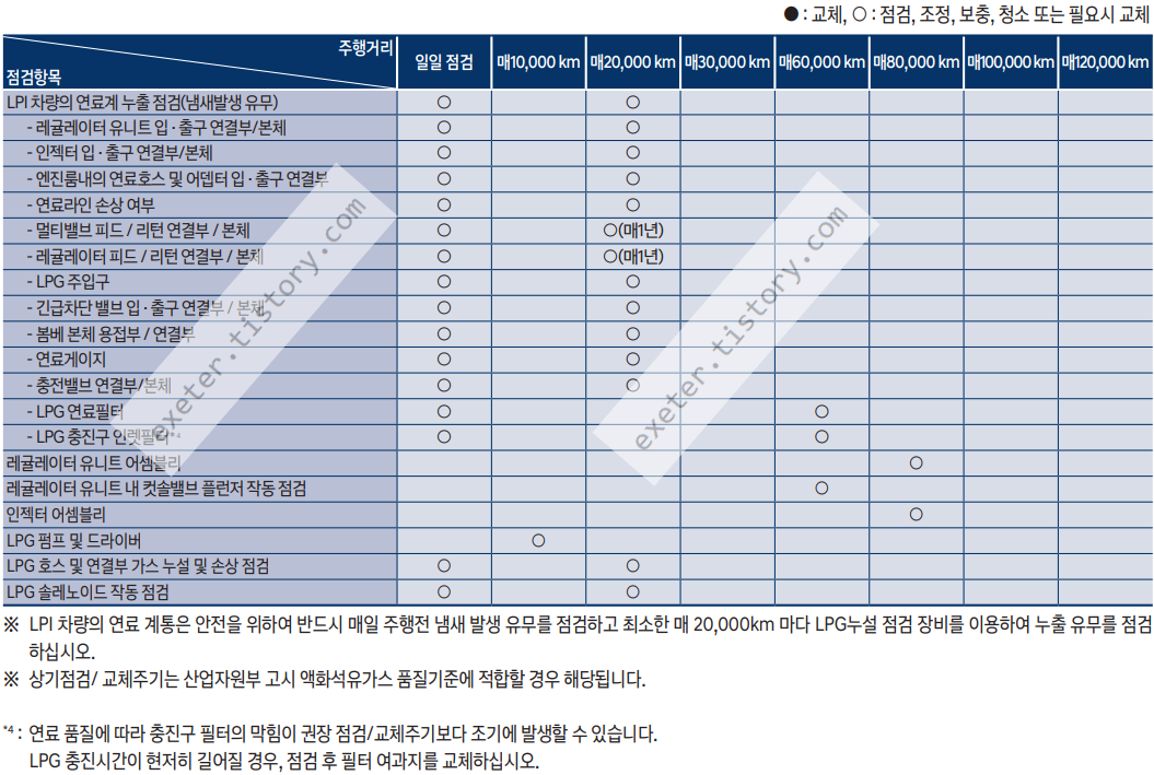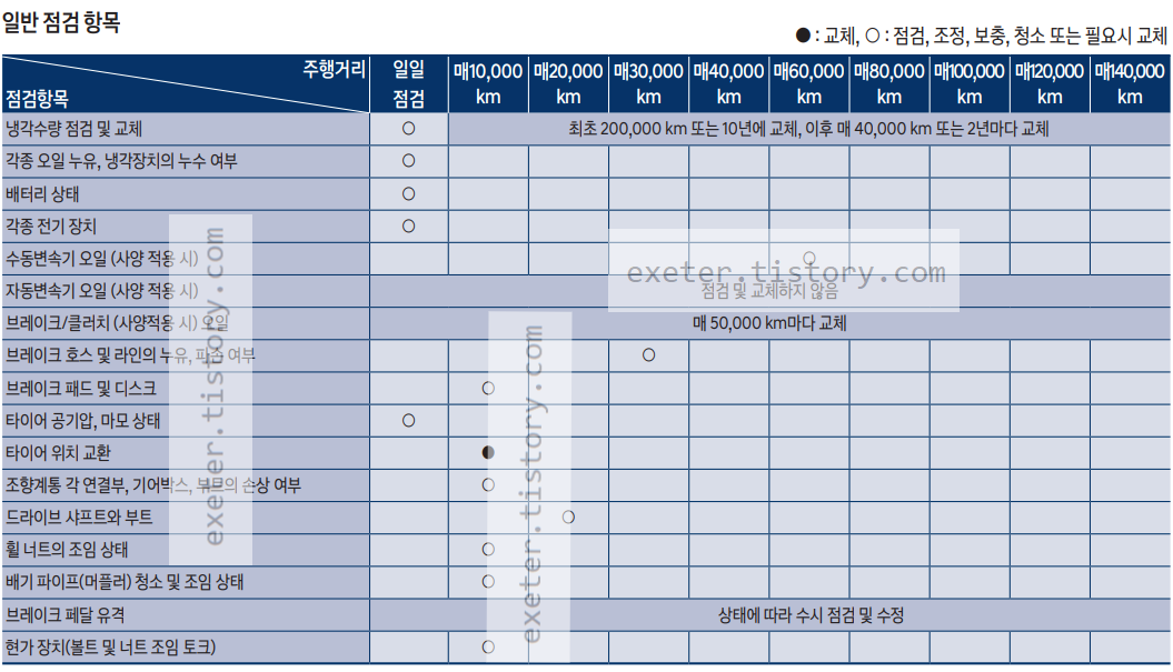 - 냉각수량 점검 및 교체: 최초 교체-20만km 또는 10년, 최초 교체 후-매4만km 또는 매2년 마다 교체