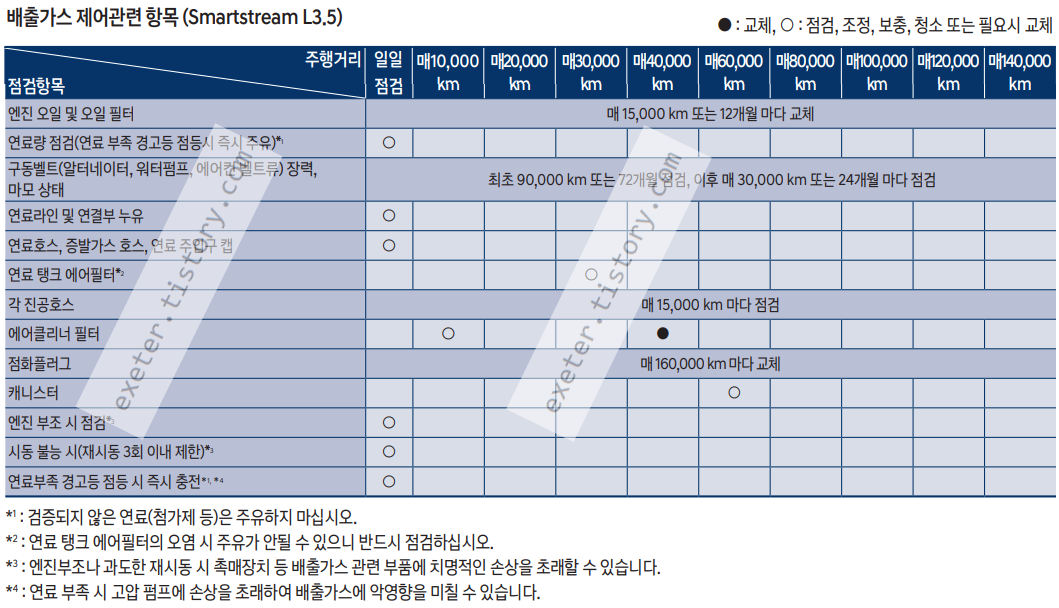 ※ 연료 관련 항목의 점검 및 교체 주기는 국내석유사업법에 명시된 경유 품질 기준을 만족시키는 연료 기준입니다.